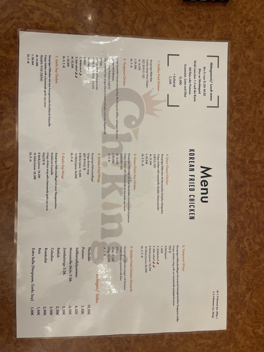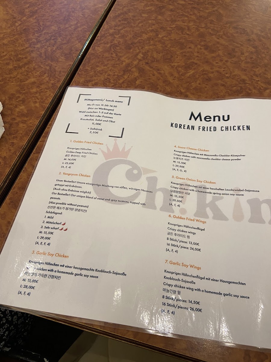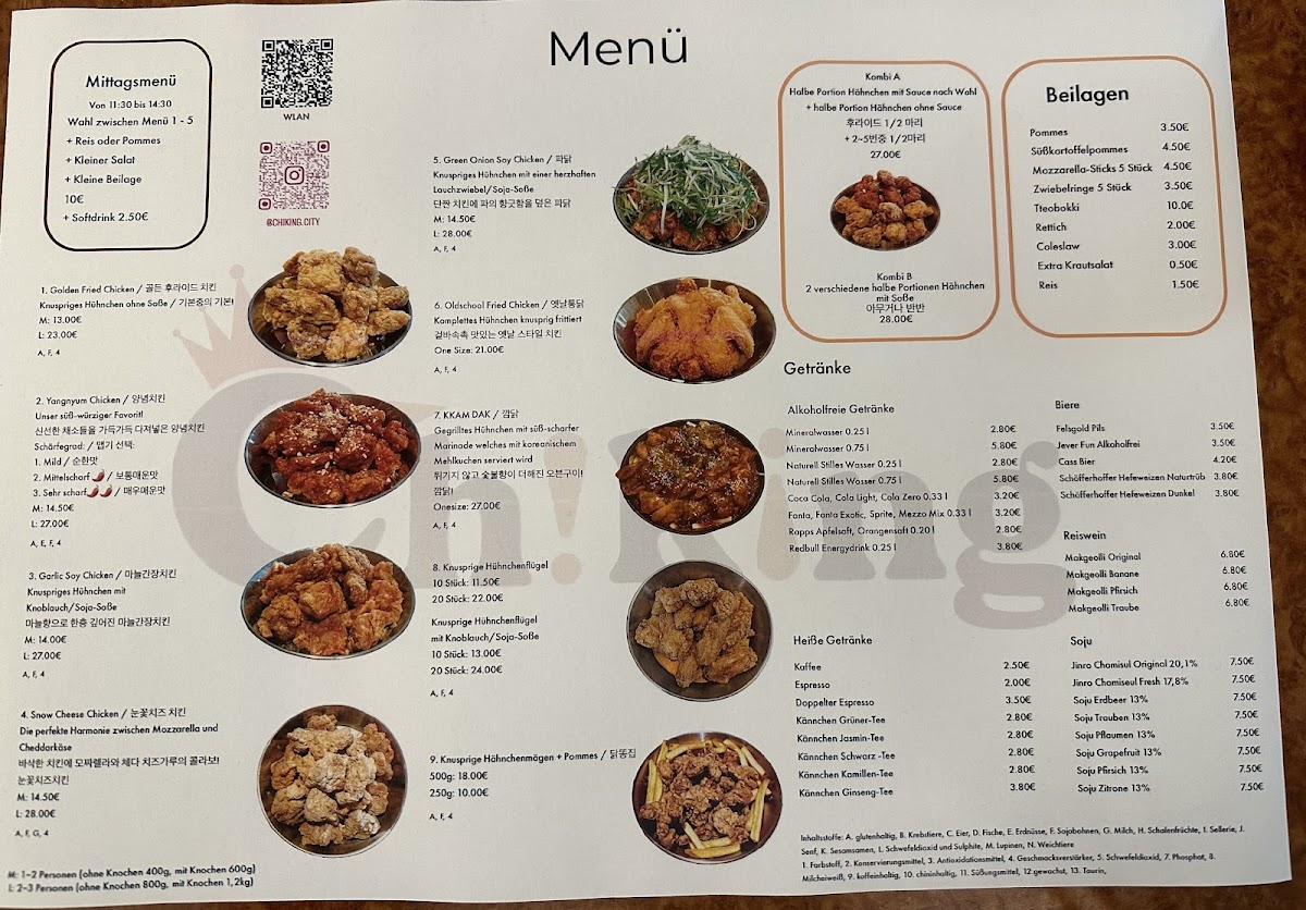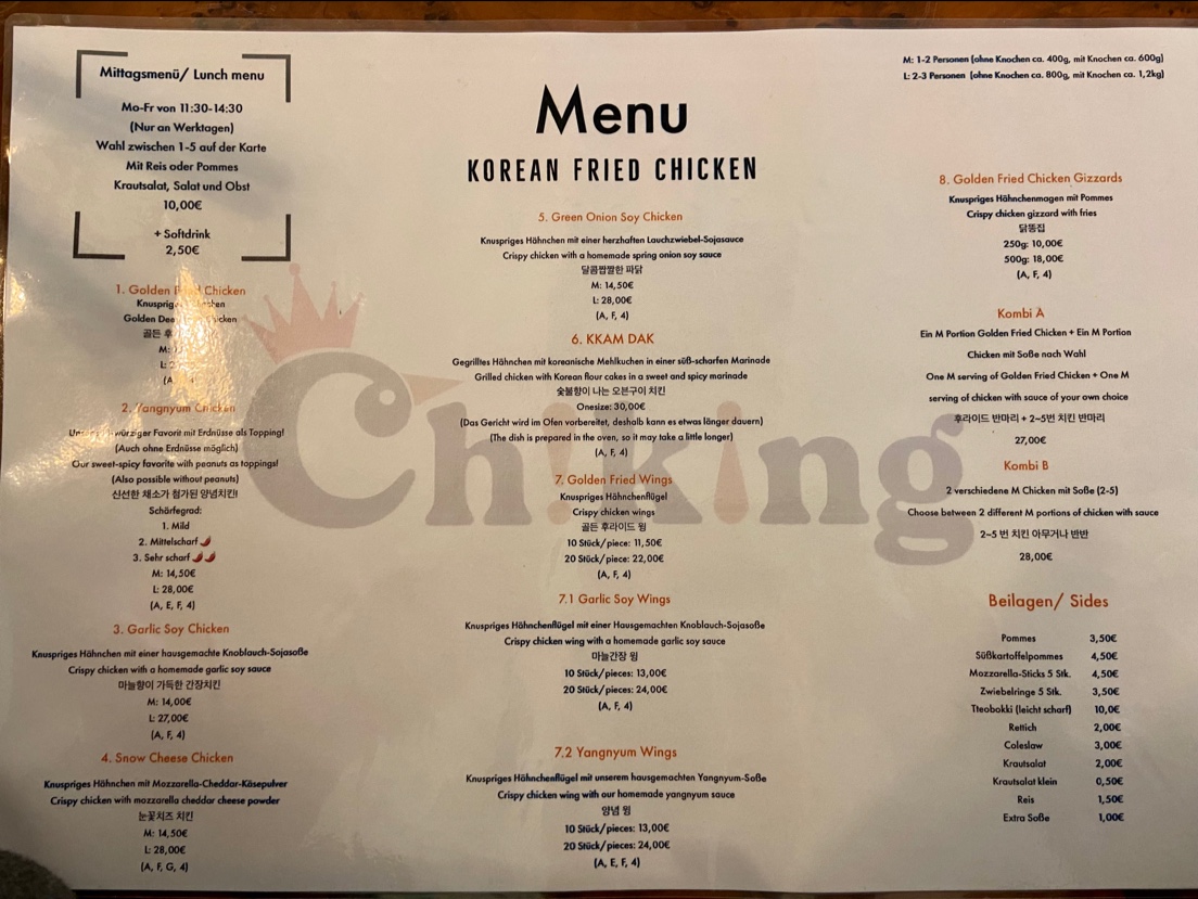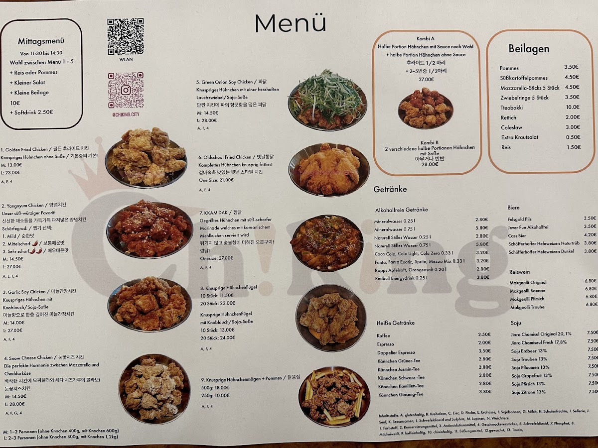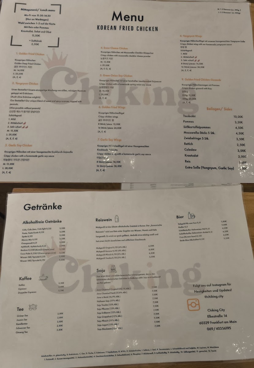 Welcome to ChiKing City, your go-to destination for an authentic taste of Korean fried chicken in the heart of Frankfurt. Located at Elbestraße 14, this vibrant eatery has captivated food lovers with its commitment to quality and flavor. With an acclaimed menu featuring handmade dishes, customers rave about the delightful crunch and succulent chicken, especially favorites like the Green Onion Soy and Snow Cheese.
